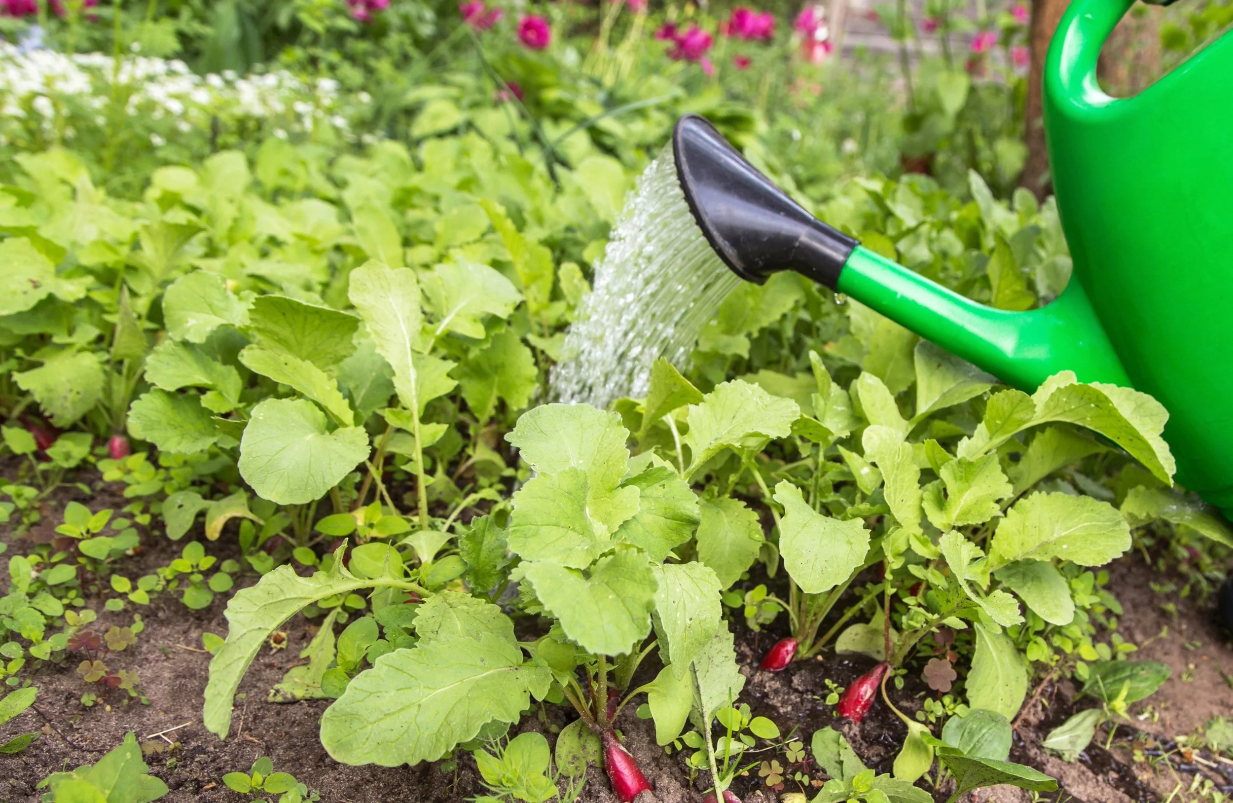 Watering radishes in garden beds